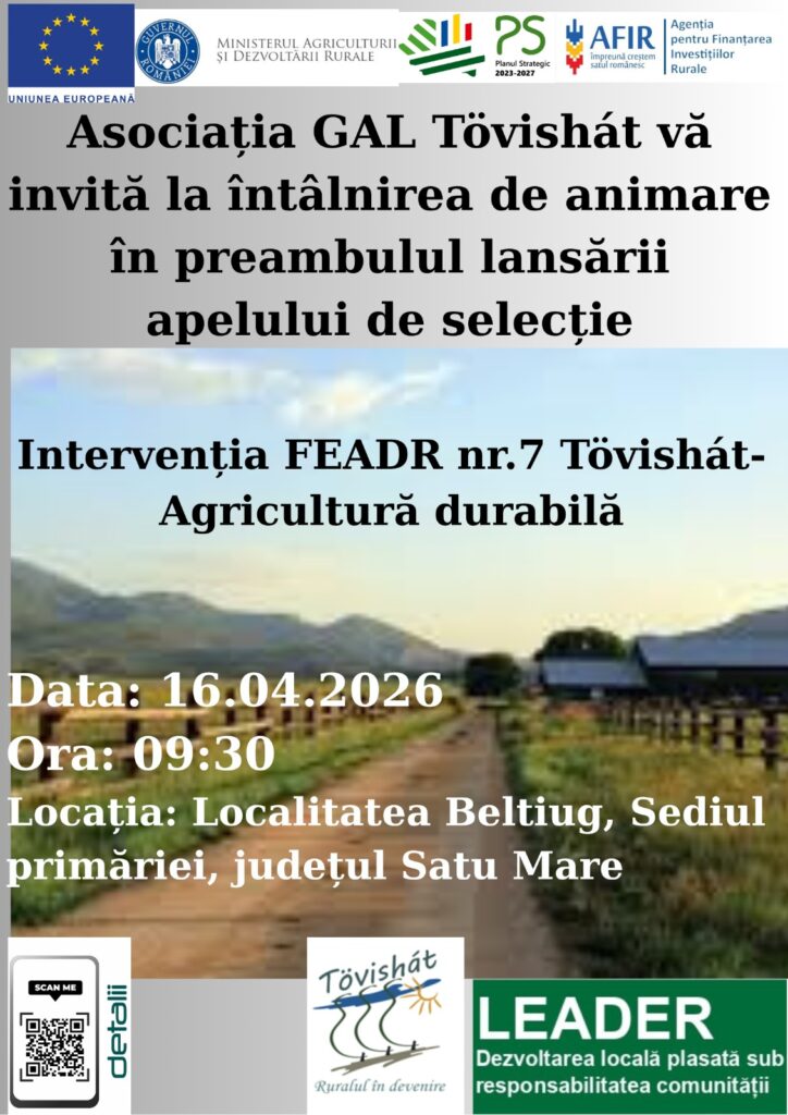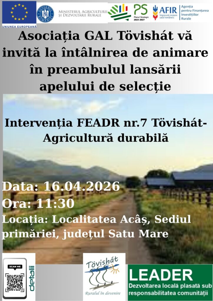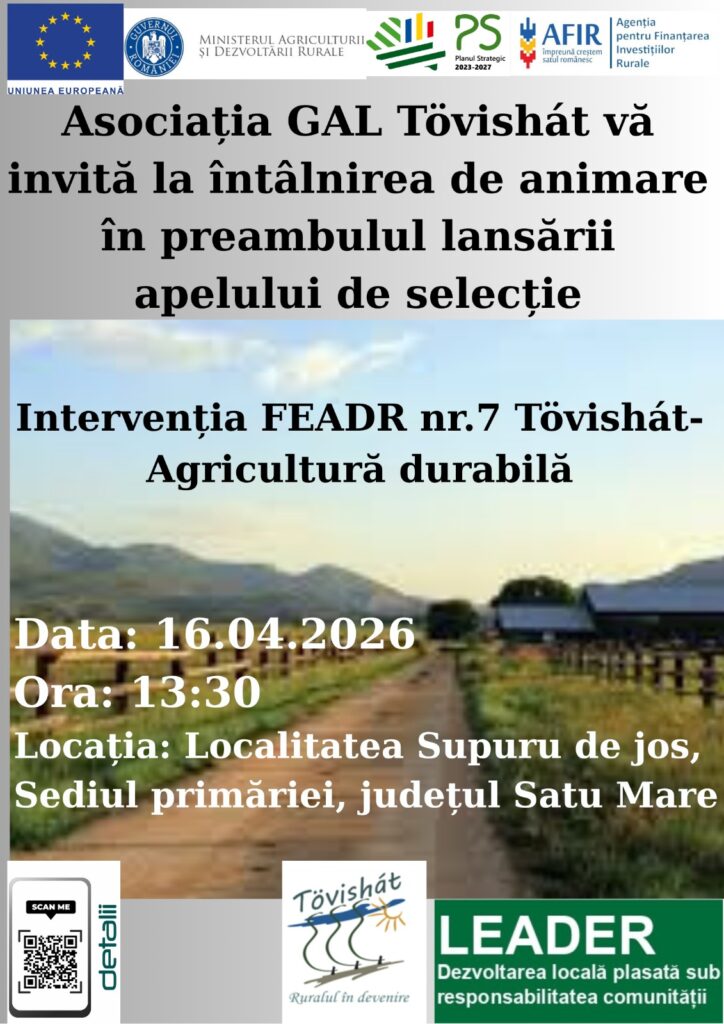 Întâlnirea va avea loc în data de 12 martie 2026, ora 11:00 , la sediul asociației GAL Tovishat din sat Hereclean, nr.34W, comuna Hereclean (Cantina Socială Hereclean.)