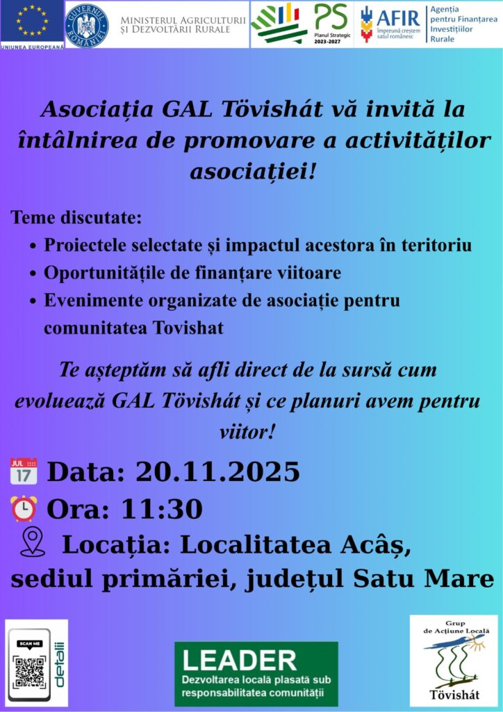 Vă așteptăm JOI, 20.11.2025 la întâlnirile de promovare a activităților asociației GAL Tovishat în următoarele locații: